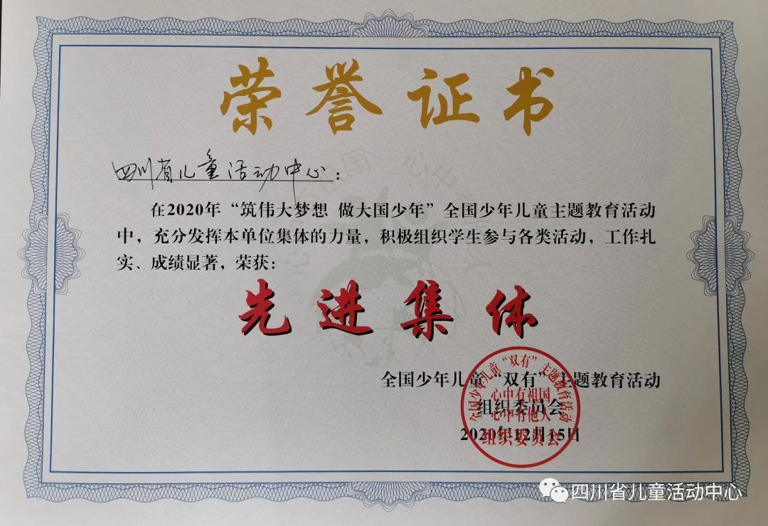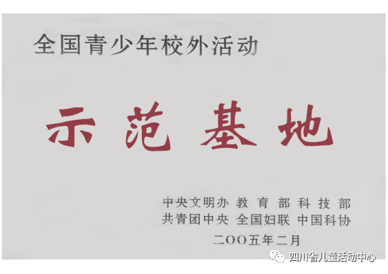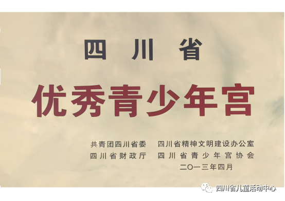 先后被中央文明办、教育部、科技部、全国妇联、团中央、中国科协等六部委评为“全国青少年校外活动”示范基地;中国小公民道德建设计划领导小组授予“全国小公民道德建设活动”实践基地;被全国妇联评为“全国儿童活动中心”先进集体;获得中宣部等十部委授予的中国青少年社会教育最高奖“银杏奖——突出贡献奖;省委宣传部、团省委、省教育厅、省妇联等六部门授予“四川省‘小公民’道德建设实践基地”;四川省青少年儿童非物质文化遗产保护传承(传习)基地等,连续30多年被教育部基础教育司、共青团中央少年部、全国妇联儿童工作部、中国儿童中心授予 “心中有祖国、心中有他人”全国少年儿童主题教育活动“优秀组织奖”。
